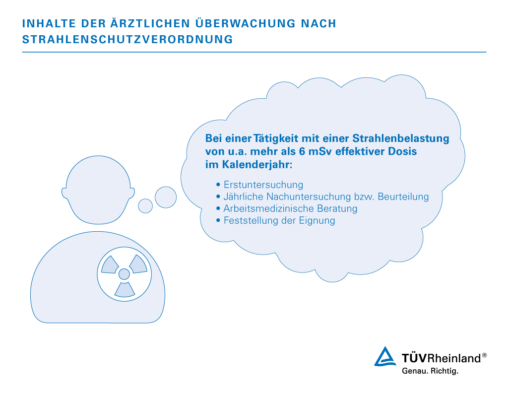 Art und Umfang richten sich neben dem Gesundheitszustand auch nach den Arbeitsbedingungen, den gesundheitlichen Folgen möglicher Zwischenfälle und der Art der Strahlenexposition.