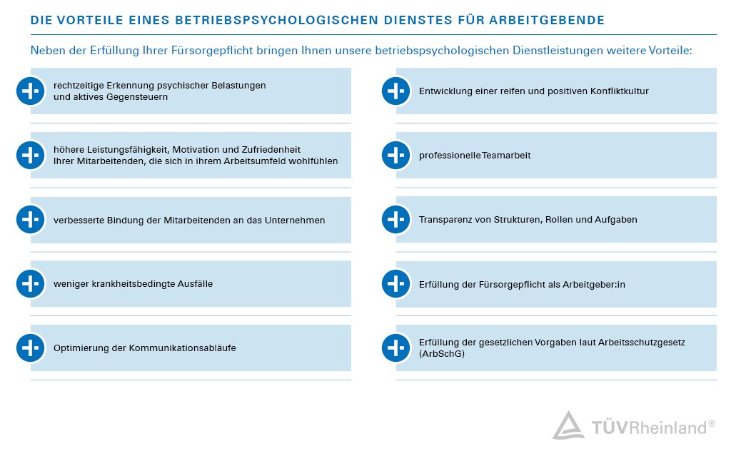 Der betriebspsychologische Dienst von TÜV Rheinland unterstützt Sie bei der frühzeitigen Erkennung und Vorbeugung psychisch belastender Faktoren in Ihrem Unternehmen. Unsere erfahrenen Betriebspsycholog:innen (mit Diplom-/Masterabschluss einer deutschen Hochschule) begleiten Sie kontinuierlich, um psychische belastende Faktoren wie hohen Zeit- und Termindruck, mangelnde Wertschätzung, ständige Erreichbarkeit und Informationsüberflutung im Arbeitsleben zu erkennen und bei Bedarf konkrete Gegenmaßnahmen einzuleiten.