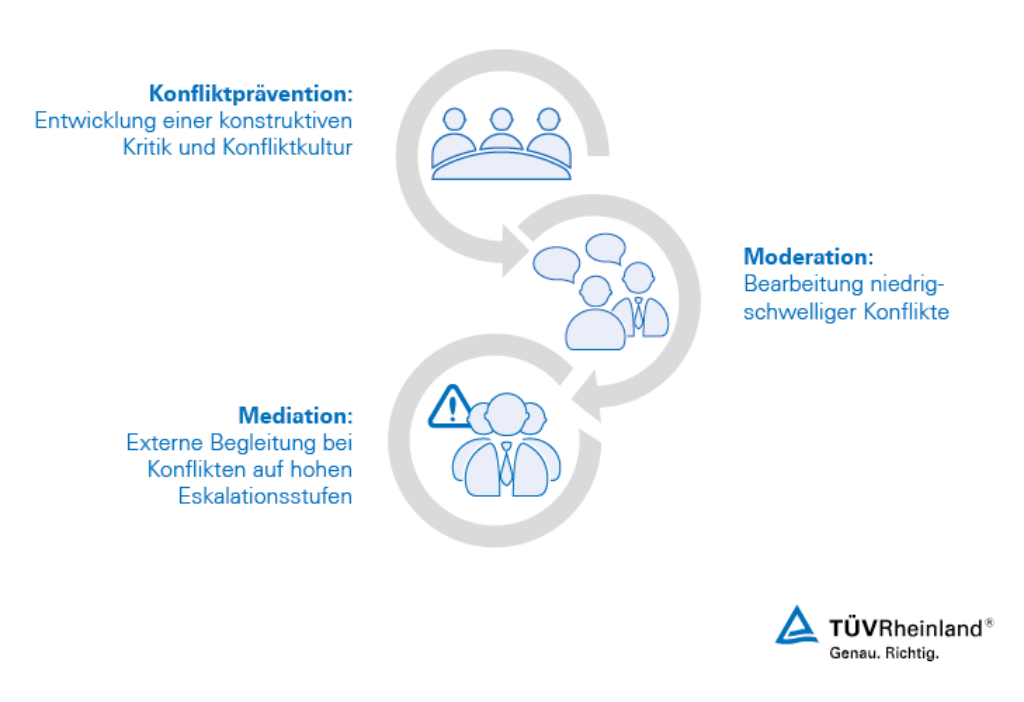 Verhindern Sie mit unserem Konfliktmanagement mögliche Eskalationen durch die Aufdeckung von Konfliktpotentialen und zeitnahem Ansprechen von Störungen.