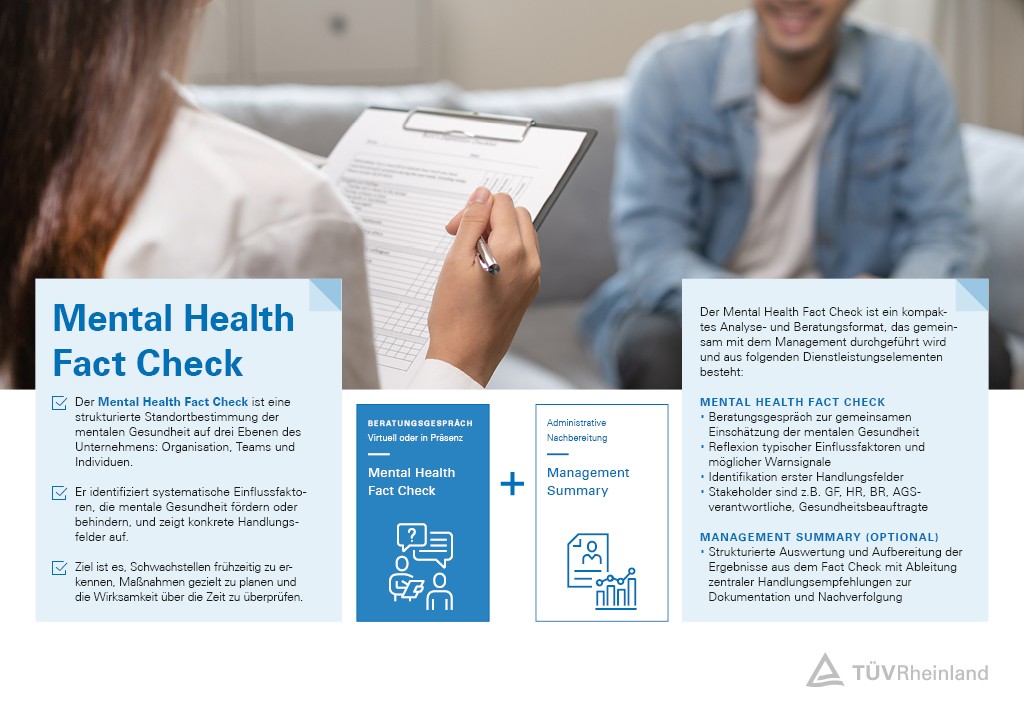 Die Kombination aus Analyse- und Beratungsformat, das von unseren Expertinnen und Experten zusammen mit dem Management erarbeitet wird, macht den Mental Health Fact Check so effizient. Erst erfolgt ein Beratungsgespräch und bereits mit der administrativen Nachbereitung erhalten Sie konkrete Handlungsempfehlungen. So verbessern Sie schnell und effektiv die mentale Gesundheit Ihrer gesamten Unternehmensstruktur – vom Individuum bis zum Ganzen.