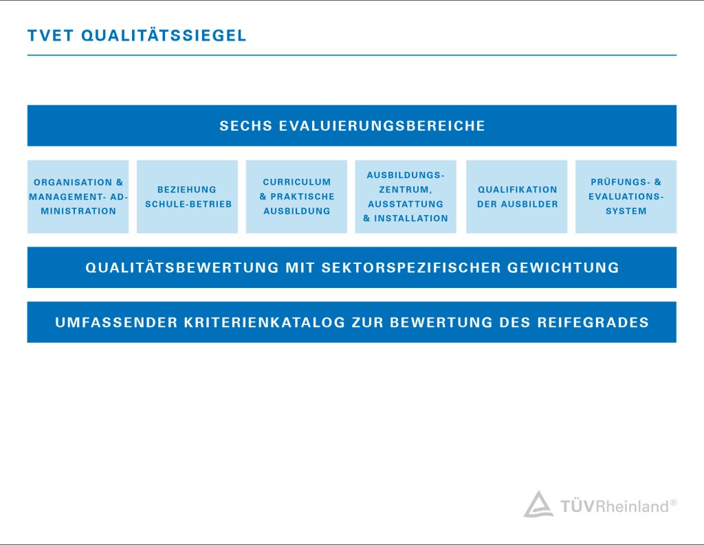 Als national wie global tätiger Bildungsdienstleister mit umfassenden Erfahrungen in der operativen Umsetzung von dualen Berufsqualifikationen hat die TÜV Rheinland Akademie die Aspekte eines TVET-Qualitätssystems nach dualen Kriterien inhaltlich und organisatorisch gebündelt und Bewertungskriterien geschaffen. Ausländische berufliche Schulen und Bildungsträger können sich damit auf ein Bewertungssystem stützen, an dem sie ihre Einrichtung ausrichten können. Nach außen lassen sich so die damit verbundenen Erfolge dokumentieren, nach innen, Anreize für eine weitere Verbesserung setzen. Im Fokus der Bewertung stehen dabei alle notwendigen Bedingungen, Strukturen und Dokumentationen, die für eine operative Umsetzung einer Ausbildung nach dualem System erforderlich sind.