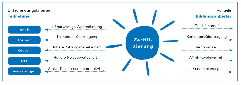 Als Schulungsanbieter im Bereich der beruflichen Weiterbildung bieten Sie Ihren Teilnehmern einen wichtigen Baustein zur persönlichen und beruflichen Entwicklung. Allerdings ist die Entscheidung für ein Bildungsangebot von einer Reihe von Faktoren abhängig, die Sie als Anbieter aktiv beeinflussen können. Als erfahrener und weltweit anerkannter Zertifizierungsstelle können wir Ihnen hier wichtige Orientierungshilfen geben, um Ihre Teilnehmerzahl signifikant zu erhöhen – unter anderem mit der Personenzertifizierung PersCert TÜV. Lassen Sie sich und Ihren Teilnehmern das Erreichen Ihrer Bildungsziele durch ein Personenzertifikat von PersCert TÜV unabhängig bestätigen. Geben Sie Ihren Teilnehmern die Möglichkeit, mit einem in der Wirtschaft und in Verwaltung anerkannten Zertifikat zu punkten. Durch die Anerkennung eines Schulungsangebotes als Grundlage für ein Personenzertifizierungsverfahren erhalten Sie einen Qualitätsnachweis, der in Certipedia dargestellt wird und werblich verwendet werden kann.