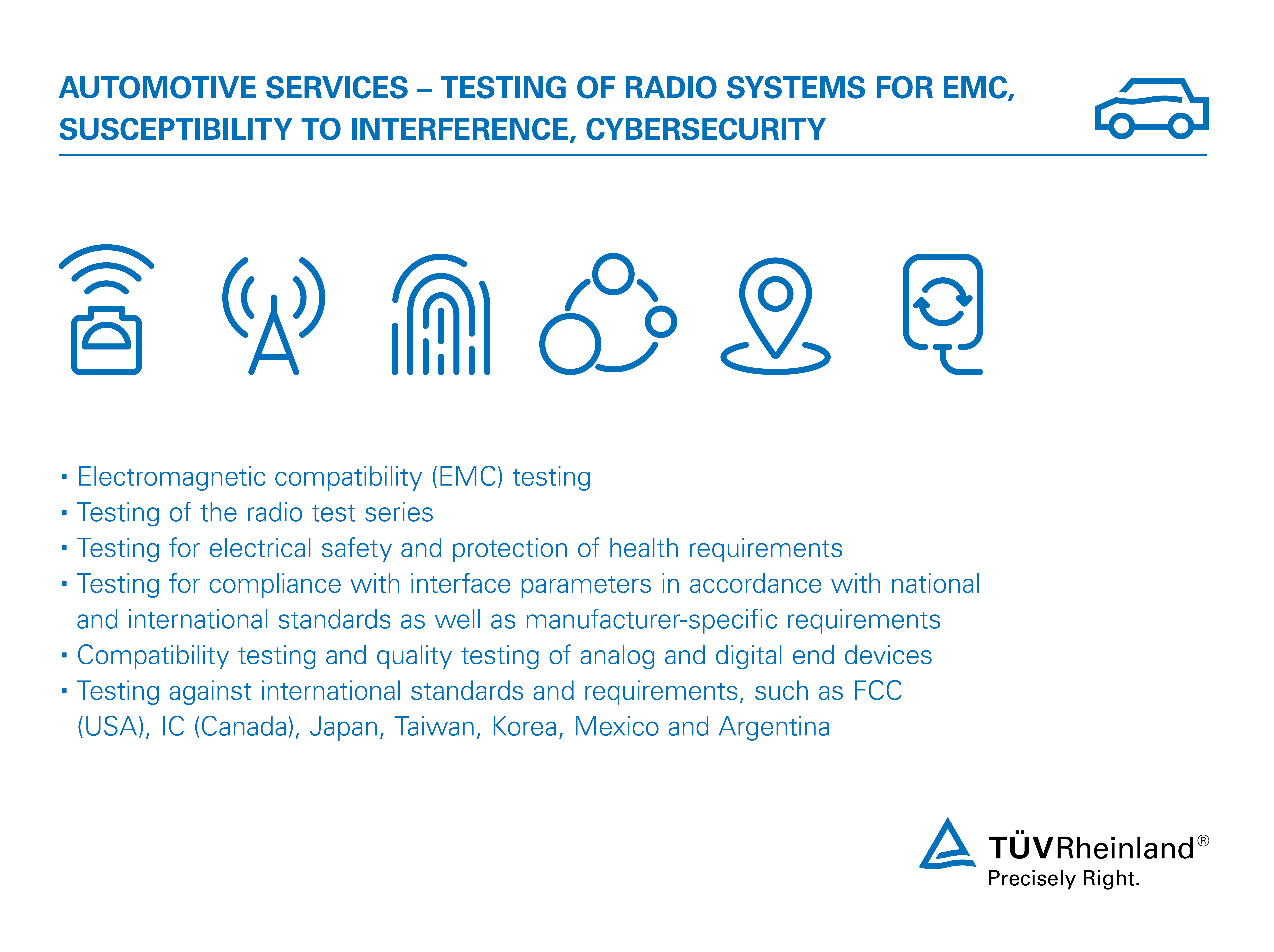 - Testing against international standards and requirements, such as FCC (USA), IC (Canada), Japan, Taiwan, Korea, Mexico and Argentina