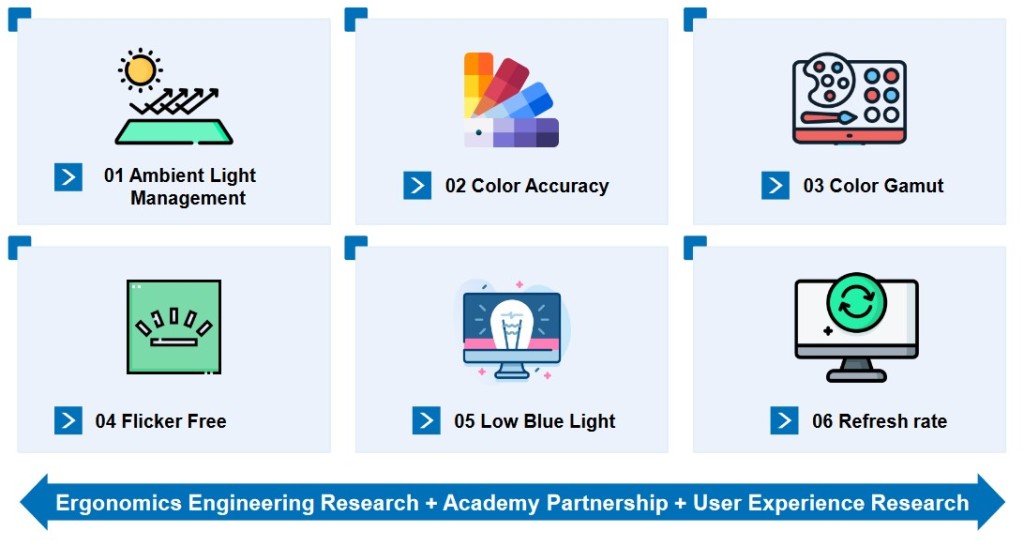 Rapid advances in display technology saw corresponding improvements in display quality in terms of pixel density, consistency, color gamut coverage, and refresh rate. At the same time, evolutionary improvements in the eye care dimension of display monitors saw the adoption of hardware low blue light technology to ensure color fidelity while reducing harmful blue light. DC modulation of LCD display backlighting helps to eliminate frequency flicker throughout the full range of brightness adjustments for effective mitigation of eye fatigue. Some studies have shown that color accuracy influences user comfort as well. Good color accuracy ensures consistency of color perception when the same content is shown on different devices. Higher refresh rates also make displays feel smoother. The reduction in streaking while watching videos, playing games, or browsing web content enhances visual comfort. The eye care concept must nevertheless continue to evolve to keep up with advances in IT products.