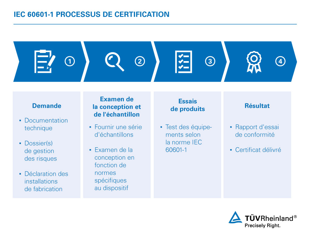 Le processus d'essai et de certification de la conformité à la norme CEI 60601-1 actuelle est une tâche complexe et à multiples facettes. La norme CEI 60601-1 impose des normes collatérales, particulières et de performance spécifique au type de dispositif, qui sont toutes requises par les référentiels de certification concernés.
