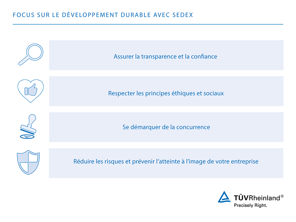 TÜV Rheinland est le bon partenaire pour les audits Sedex partenaire pour les audits Sedex au format SMETA. En tant que membre agréé du groupe de sociétés d'audit Sedex, nous nous efforçons de vous soutenir avec notre expertise complète à chaque étape du processus. Faites confiance à nos spécialistes pour vous donner un avantage sur la concurrence !