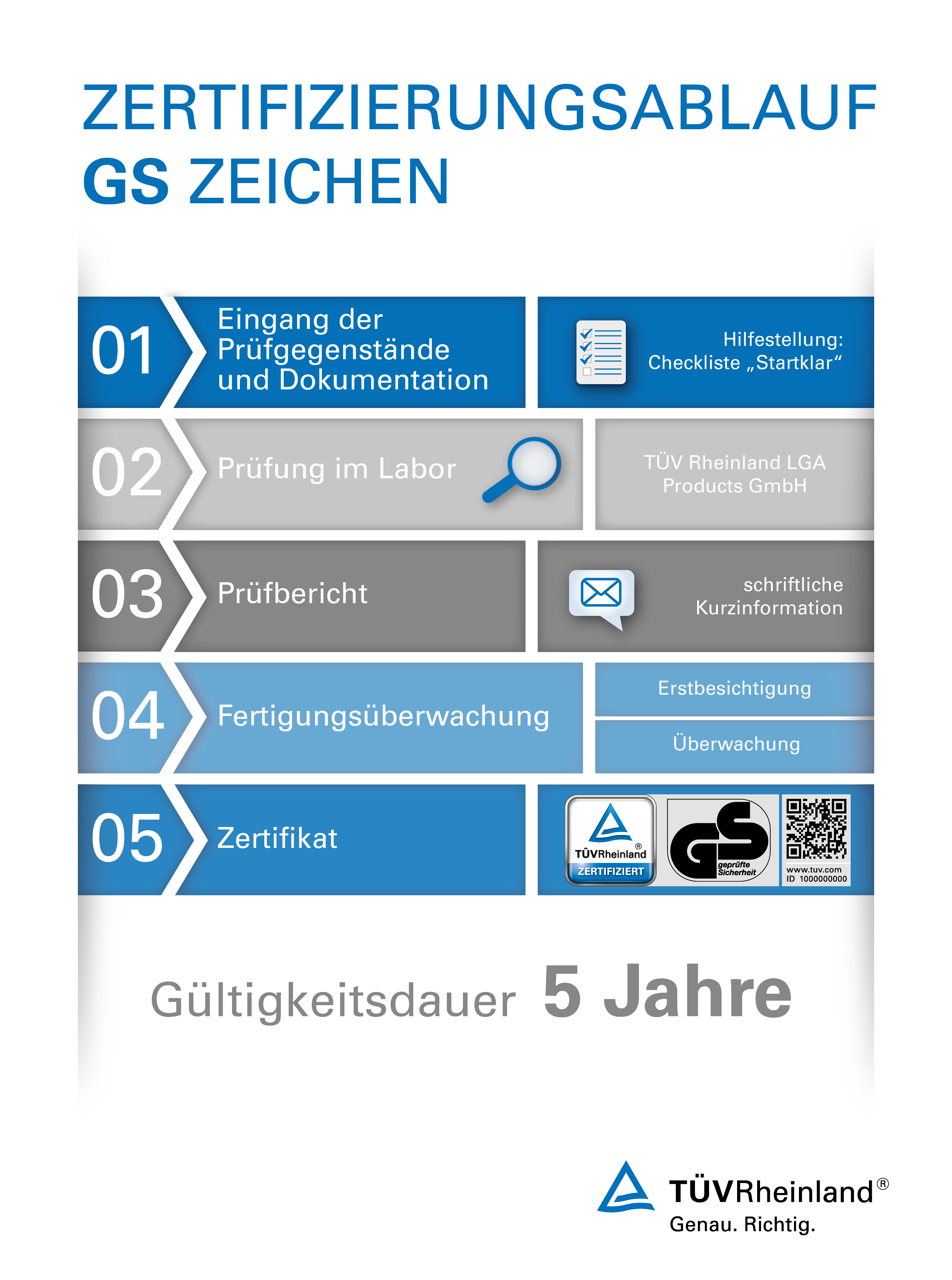 Damit Sie das GS-Zeichen behalten können, sieht das Gesetz die regelmäßige Inspektion/Überprüfung der Fertigungsstätte vor, um eine kontinuierliche Kontrolle der Produktion zu gewährleisten. Bei Veränderungen an dem Produkt müssen Sie uns im Vorfeld darüber informieren, da die Gültigkeit des Zertifikates sonst erlischt. Das GS-Zeichen erfordert einen höheren Grad der Prüfung, der die Grundanforderungen für die CE-Kennzeichnung (Selbstdeklarierung des Herstellers) übersteigt.
