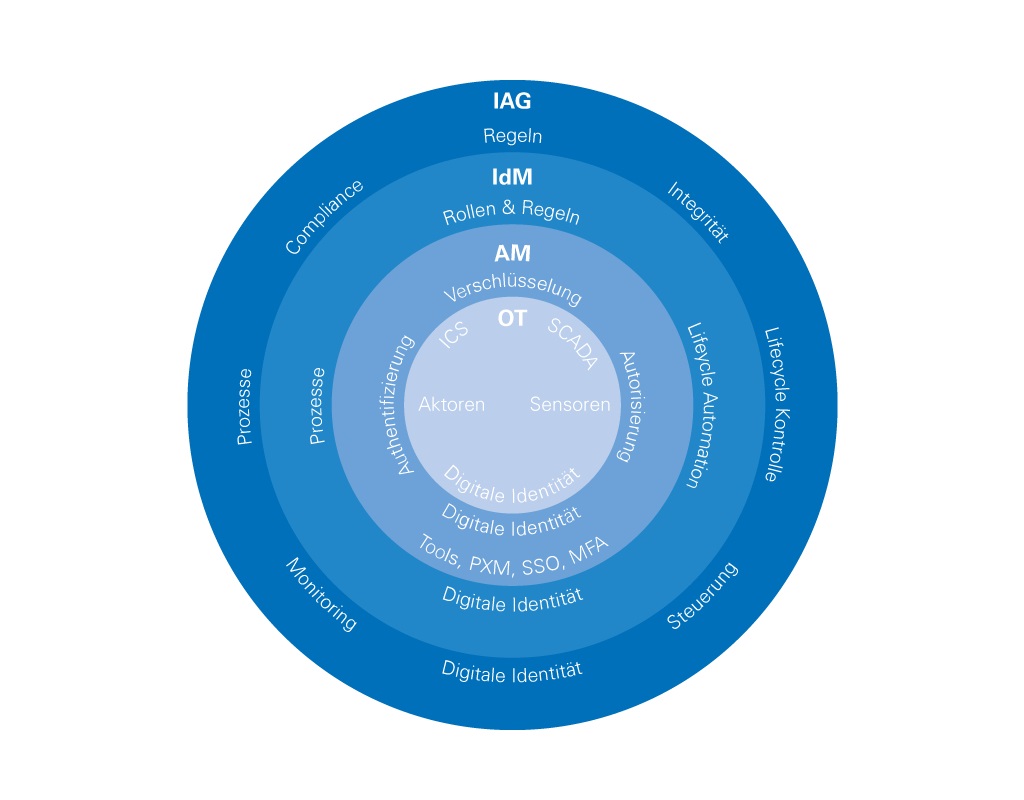 Wir unterstützen sowohl bei einer holistischen Neuausrichtung des Systems als auch bei der Anpassung einzelner Aspekte. Unser Beratungsangebot unterteilt sich in vier Ebenen mit unterschiedlichem Detailgrad, die sowohl die strategische Beratung (IAG) als auch kurzfristige Handlungsempfehlungen (Identity Management (IdM) und Access Management (AM)) umfassen. Hinzu kommen Operational Technologies (OT) und Information Technologies (IT), die die eigentlichen Komponenten des Systems darstellen.