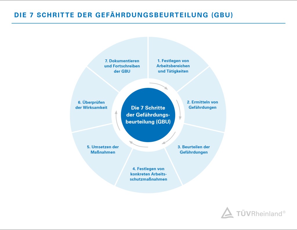 Die Gefährdungsbeurteilung ist gesetzlich vorgeschrieben. Zum Erstellen einer Gefährdungsbeurteilung ist es hilfreich, sich an folgende sieben Schritte zu halten: