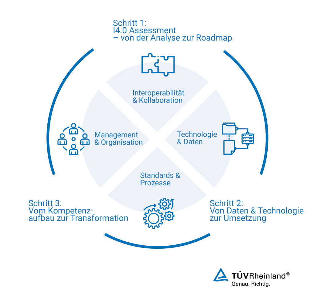 Wir von TÜV Rheinland unterstützen Sie dabei, eine passende Roadmap für die Digitalisierung Ihres Unternehmens zu entwickeln sowie Technologien sicher nutzbar zu machen, und wir helfen Ihnen, zielgerichtet sowohl technische als auch Managementfähigkeiten zu entwickeln und Ihre Mitarbeiter erfolgreich „mitzunehmen“ auf dem Weg Richtung Industrie 4.0.