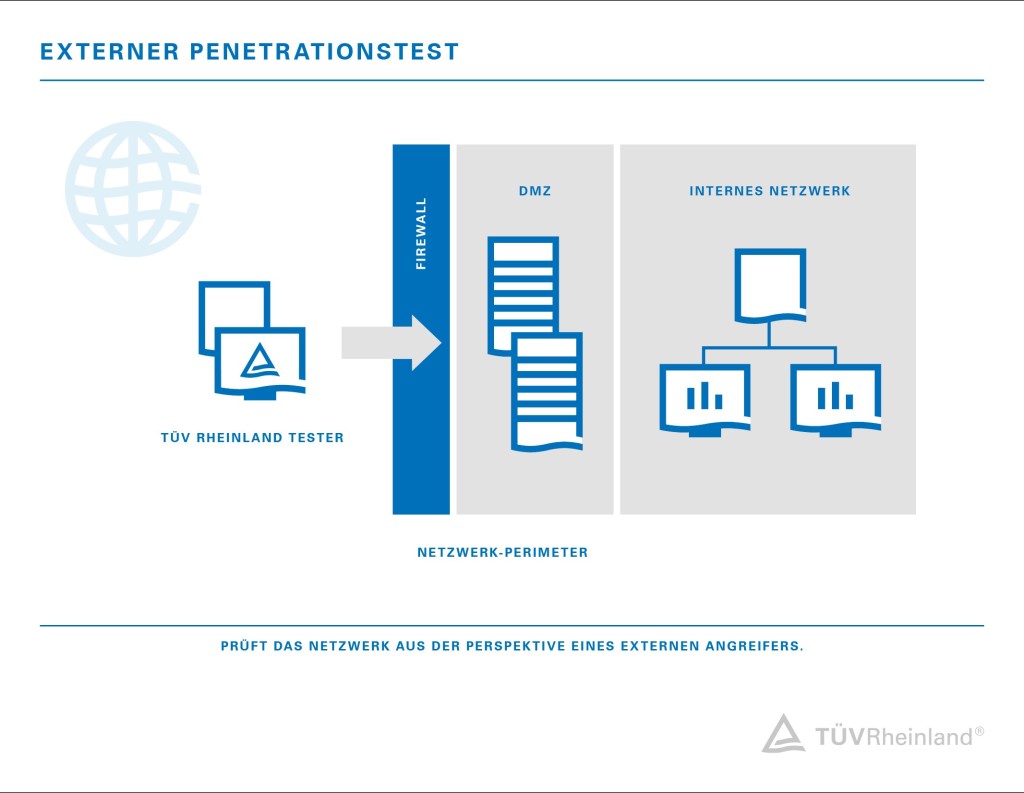 Der externe Penetrationstest symbolisiert den „klassischen“ Cyberangriff von außen. Dabei versucht unser IT-Security-Experte über die aus dem Internet erreichbaren Systeme in das unternehmensinterne Netzwerk einzudringen. Im Fokus der Untersuchung liegen die Firewall und Systeme der Demilitarisierten Zone (DMZ – ein Netzwerk, das als Pufferzone fungiert und von der Firewall überwacht wird, wie z.B. Web- oder Mailserver), um anschließend die Möglichkeiten eines Datenzugriffs- oder Diebstahls aufzudecken. Unsere Experten versuchen auch – sofern erlaubt – von der DMZ in das interne Netzwerk vorzudringen.