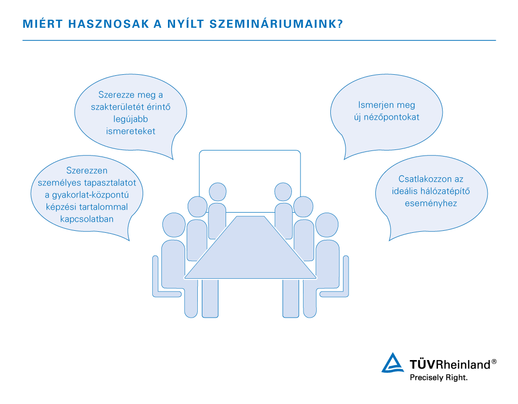 Tapasztalt oktatói hálózatunk révén témák széles körét tudjuk lefedni. Aktuális témájú szemináriumokat kínálunk olyan változatos témákban, mint az építőipar (pl. tűzvédelem és építési technológia); a mérnöki tudományok (pl. villamosmérnöki terület és karbantartás); egészségügy, környezetvédelem és energia; munkahelyi biztonság; minőségbiztosítás; vagy IT-biztonság és adatvédelem.