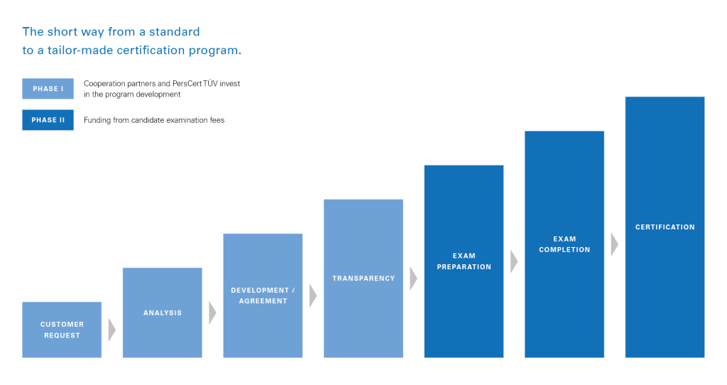 When developing the certification program, we define the admissions requirement, the examination method (e.g. written, oral, practical exam), the examination tools and, the recertification process. Ongoing development of your program enables your learners to keep in pace with the evolving requirements of the market. PersCert TÜV develops recertification procedures in which your participants must regularly prove that their skills are up-to-date. When all the parameters are defined, a cooperation agreement is concluded between PersCert TÜV and you as a cooperation partner.