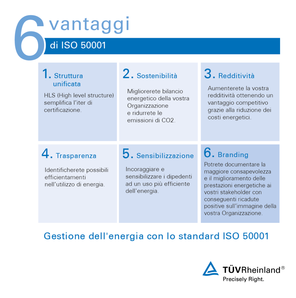 Lo standard internazionale ISO 50001 definisce i requisiti per l'introduzione, l'implementazione e il miglioramento di un Sistema di Gestione dell'Energia da parte delle Organizzazioni. Con un sistema di gestione dell'energia è possibile migliorare il proprio bilancio energetico, ridurre le emissioni di CO2, abbassare i costi ed utilizzare l'energia in modo più efficiente.