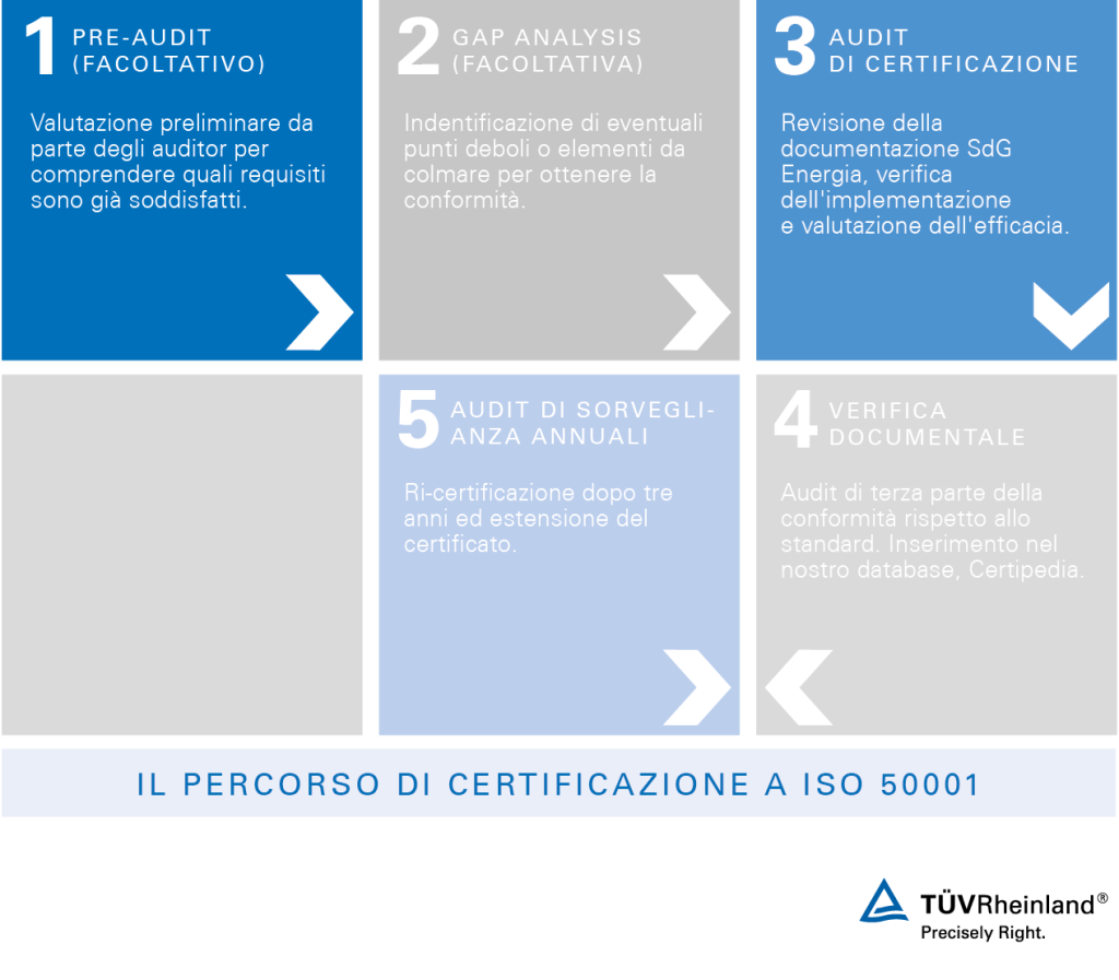 - Audit di certificazione: Verifica della vostra documentazione e dell’applicazione pratica del vostro sistema di gestione dell’energia