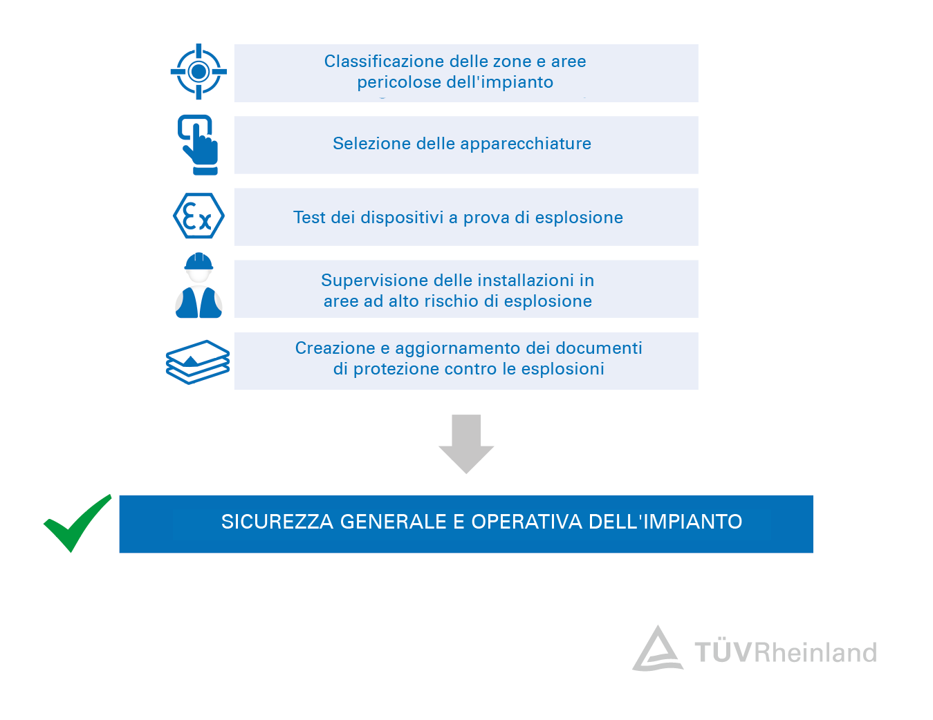 Garantisci il funzionamento sicuro delle apparecchiature destinate all'uso in atmosfere potenzialmente esplosive e assicurati che i sistemi di protezione siano intatti e funzionino correttamente. In qualità di società autorizzata per le ispezioni relative alla protezione antincendio e contro le esplosioni, supportiamo coloro che operano nei settori chimico, petrolifero e del gas, e in altre industrie, assicurandoci che gli impianti e le attrezzature funzionino in sicurezza.