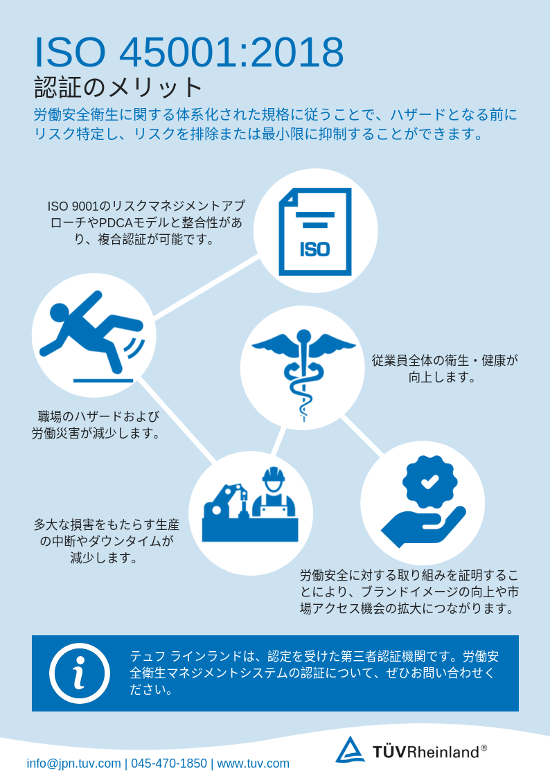 職場における従業員の安全確保と健康維持は、従業員と事業者の双方にとって、意欲的で生産性の高い職場の実現に不可欠なことです。ISO 45001は、労働安全衛生管理に関する規格であり、職場での健康被害や事故発生リスクの軽減に役立ちます。ISO 45001は、従来の BS OHSAS 18001 に取って代わり、2018年3月12日に発行されました。