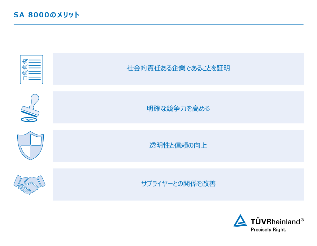 SA 8000認証は企業の社会的説明責任に関する国際規格です。この任意の認証を取得した企業は労働者の権利を守る企業であるとみなされます。SA 8000は企業統治における社会的責任の取り組みの土台となるものです。同認証の取得には、 BSCI規格 や ISO9001 を満たす水準のマネジメントが行われていなければなりません。SA 8000は、企業規模、業界、所在地を問わず、グローバルに事業を行う企業やグローバルに製品を供給するサプライヤーに適しています。