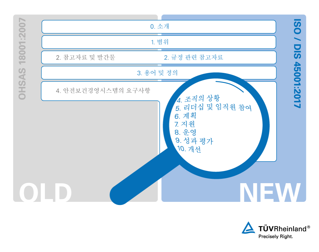 산업현장에서의 안전과 보건에 대한 철저한 관리와 유지는 고용주 및 직원 모두를 위한 생산적인 업무 프로세스와 동기 부여를 위한 중요한 전제조건입니다. 2018년 초, 안전보건경영시스템에 대한 새로운 ISO 45001 표준이 발표됩니다. 이 표준은 산업 안전과 보건에 대한 이전 표준인OHSAS 18001 를 대체하게 되며, 산업현장에서의 사고 위험을 최소화할 것입니다. BS OHSAS 18001은 영국 표준 협회(BSI)에서 개발했으며 새로운 ISO 45001 기반을 이룹니다. '프로젝트 위원회 PC 283'은 표준화(ISO)를 위한 국제 조직으로, 2013년 3월 BSI의 새로운 국제적 표준 개발 제안 기획서를 받아들여 현재 개발 중에 있습니다. ISO 45001 표준 전환 및 주요 질문에 대한 답은 TÜV 라인란드의 FAQ 를 참고하시기 바랍니다.