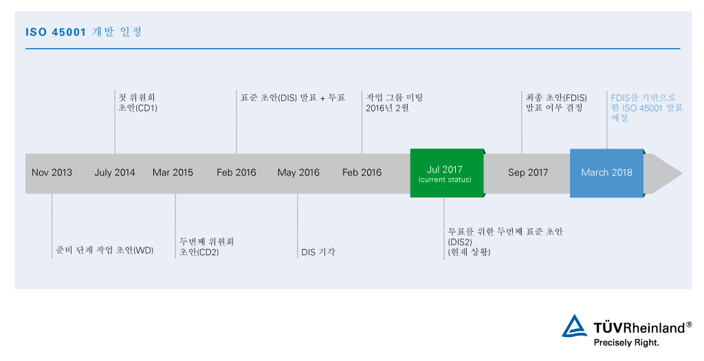 2017년 여름, 두 번째 초안 버전(DIS2)에 대한 투표가 실시된 후, 늦어도 2018년 3월에는 새로운 안전보건경영시스템 ISO 45001가 최종 발표될 예정입니다.