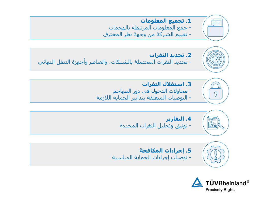 تحظى بنظرة عامة شاملة حول الثغرات المحتملة في شبكتك، ونظام تكنولوجيا المعلومات والتطبيقات وأجهزة الهواتف المحمولة الخاصة بك. يُقدم لك خبراؤنا كيفية الحماية الكاملة لمؤسساتك ضد الهجمات الإلكترونية؛ لمنع التجسس الصناعي والدخول غير المصرح به. مما يتيح لك الحفاظ على سرية وسلامة البيانات، وتقليل مخاطر المسئولية.
