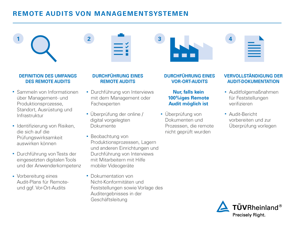 Remote Audits haben sich insbesondere durch die Corona-Krise bei Unternehmen etabliert. Aber zukünftig wird – unabhängig von Corona – die Möglichkeit der Remote Auditierung ein wichtiges und bleibendes Angebot an unsere Kunden sein. TÜV Rheinland hat bereits 5.000 Remote Audits weltweit durchgeführt. Die digitalen Verfahren bergen für Unternehmen mehr Flexibilität, Termine können online durchgeführt werden, Reise- und Vor-Ort-Aufwände lassen sich reduzieren.