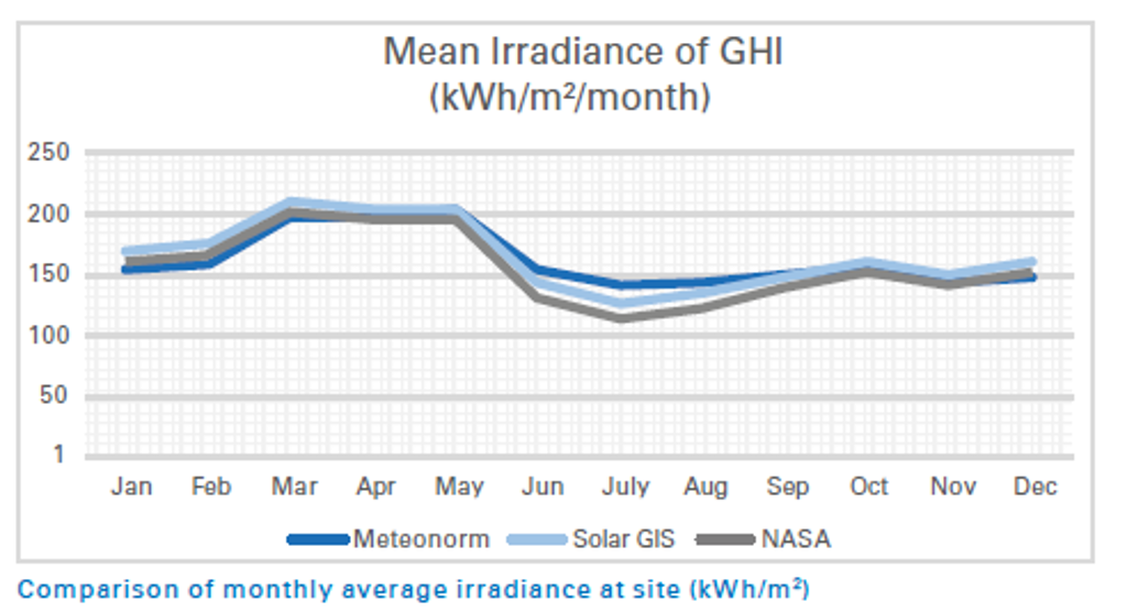 Over a period of six months, a team at TÜV Rheinland reviewed the contents and terms of all PV module contracts, EPC agreements and purchase orders. Our experts assessed contract-specified guarantees and warranties to ensure policy compliance to industry norms. We made sure liquidity damages were appropriately defined within the contracts to avoid any major losses due to contractor delay or plant nonperformance. Our comprehensive technical due diligence report as lender’s independent engineer provided our client critical information, confirming contracts were well defined and risk to the developer was minimal. Our solar specialists received information from three sources to compare results proving good irradiance throughout the year at the site. Figures provided by Meteonorm, Solar GIS and NASA were extremely close, ensuring reliable results for technical due diligence analysis purposes.