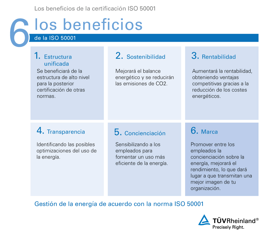 La norma internacional ISO 50001 define los requisitos para que las empresas implementen y mejoren su sistema de gestión energética. Los posibles beneficios son; un mejor balance energético, la reducción de emisiones de CO2 y una notable mejora de los costes energéticos mediante un uso más eficiente de la energía. Lo que influye directamente en una mayor rentabilidad y mayores ventajas competitivas con menos costes energéticos.
