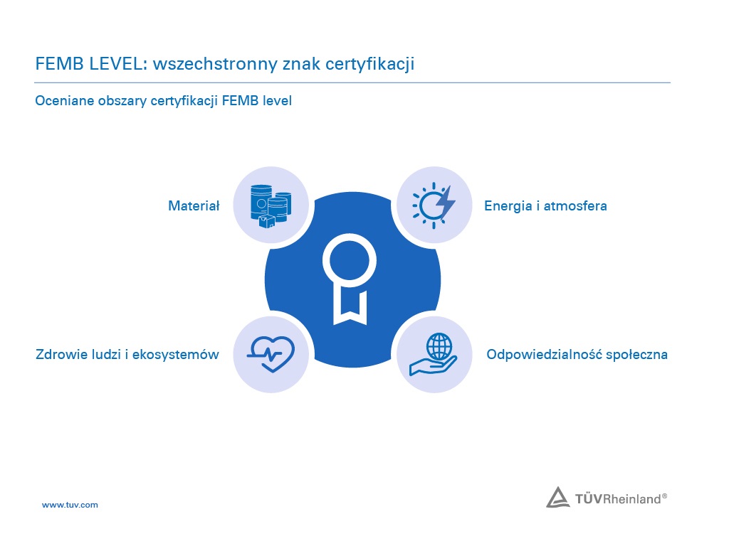 W trakcie certyfikacji FEMB level® wyrób oceniany jest pod kątem spełnienia wymagań w następujących obszarach: