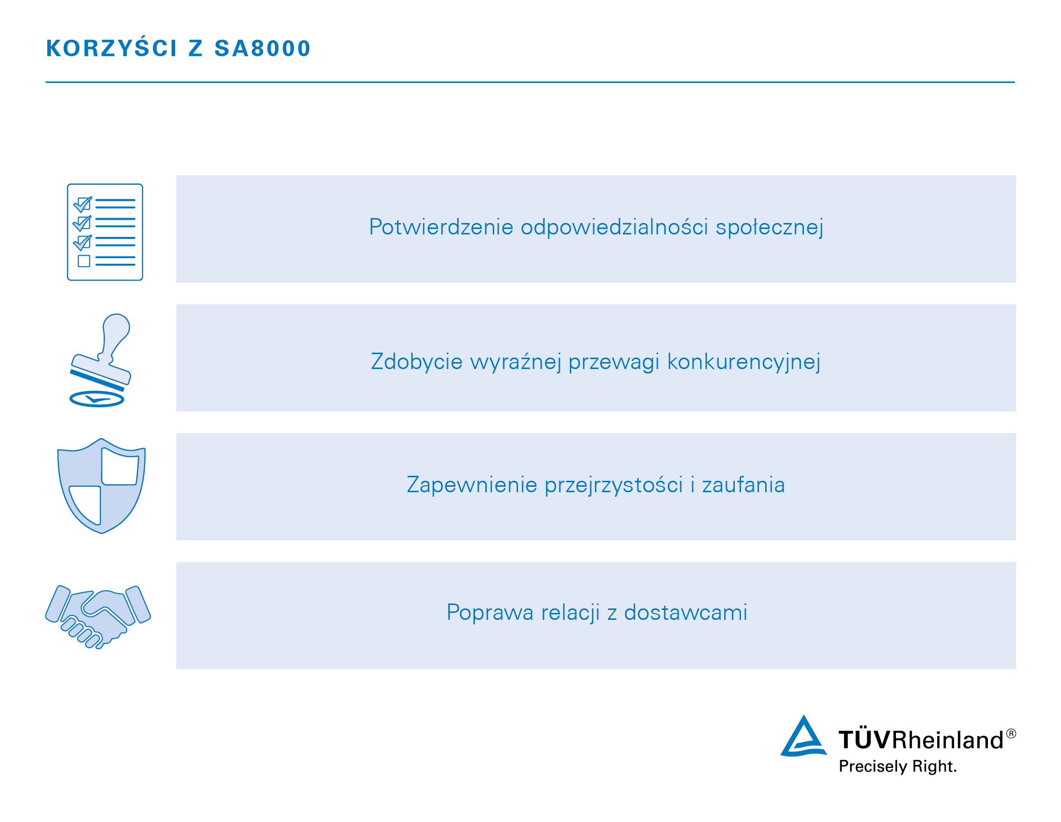 Certyfikat SA8000 stanowi dowód zaangażowania w przestrzeganie praw człowieka i cieszy się zaufaniem opinii publicznej, partnerów i klientów. Uzyskana w ten sposób przewaga konkurencyjna wykracza poza rozwój marki: przejrzyste wytyczne dotyczące standardów odpowiedzialności społecznej prowadzą do prężnych i trwałych relacji biznesowych z dostawcami, dając jasny przekaz potencjalnym i obecnym pracownikom, że bezpieczeństwo i higiena pracy, różnorodność i integracja, jak również otwarta komunikacja są w Państwa firmie czymś oczywistym. Dzięki zapewnieniu uczciwych warunków pracy pozyskiwani są również wartościowi pracownicy, a ich rotacja zmniejsza się.