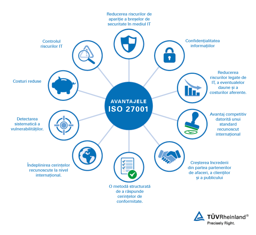 Sistemele IT complexe pot procesa acum o mulțime de informații însă, în același timp, devine din ce în ce mai dificil să protejezi aceste informații. Cu o certificare ISO 27001, vă oferim o evaluare independentă a gradului de conformitate a sistemului dumneavoastră de management al securității informației (ISMS) cu cerințele ISO/IEC 27001.