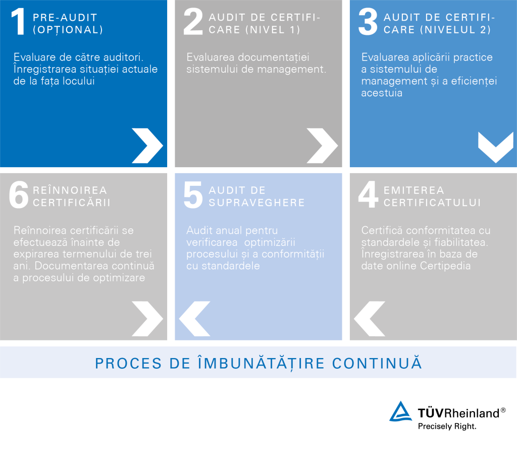 Disclaimer: La TÜV Rheinland, neutralitatea, obiectivitatea, independența și imparțialitatea activităților noastre sunt de cea mai mare importanță. Activitățile noastre de evaluare și audit respectă aceste valori în conformitate cu cerințele de acreditare aplicabile. Toate măsurile structurale, organizaționale și procedurale necesare sunt în vigoare la toate nivelurile organizației pentru a evita conflictele de interese (de exemplu, separarea riguroasă a consultanței și certificării) și pentru a asigura imparțialitatea. Nu oferim și nu furnizăm consultanță privind sistemele de management de către un organism de certificare acreditat pentru sistemele de management. În cadrul grupului TR, asigurăm un interval de cel puțin 2 ani între activitatea de consultanță și de certificare a sistemelor de management pentru același client.
