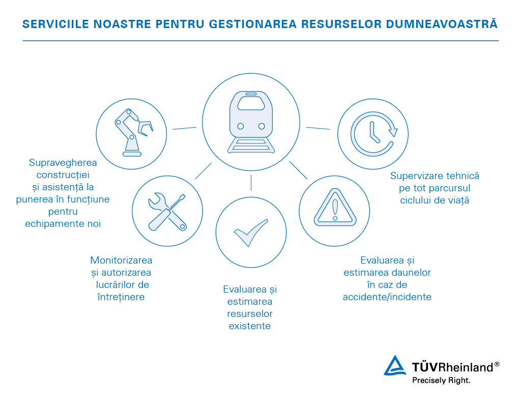 În toate aceste cazuri, noi suntem partenerul potrivit pentru dumneavoastră. Experții noștri vă asistă în timpul producției de vehicule asigurând calitatea, monitorizând implementarea contractului, construcția infrastructurii și facilităților feroviare. Vă putem oferi suport în testarea și evaluarea condiției echipamentelor și la estimarea ulterioară a valorii acestora. De asemenea, beneficiați de echipa noastră interdisciplinară, de experiența noastră vastă și de cunoștințele practice cuprinzătoare rezultate.