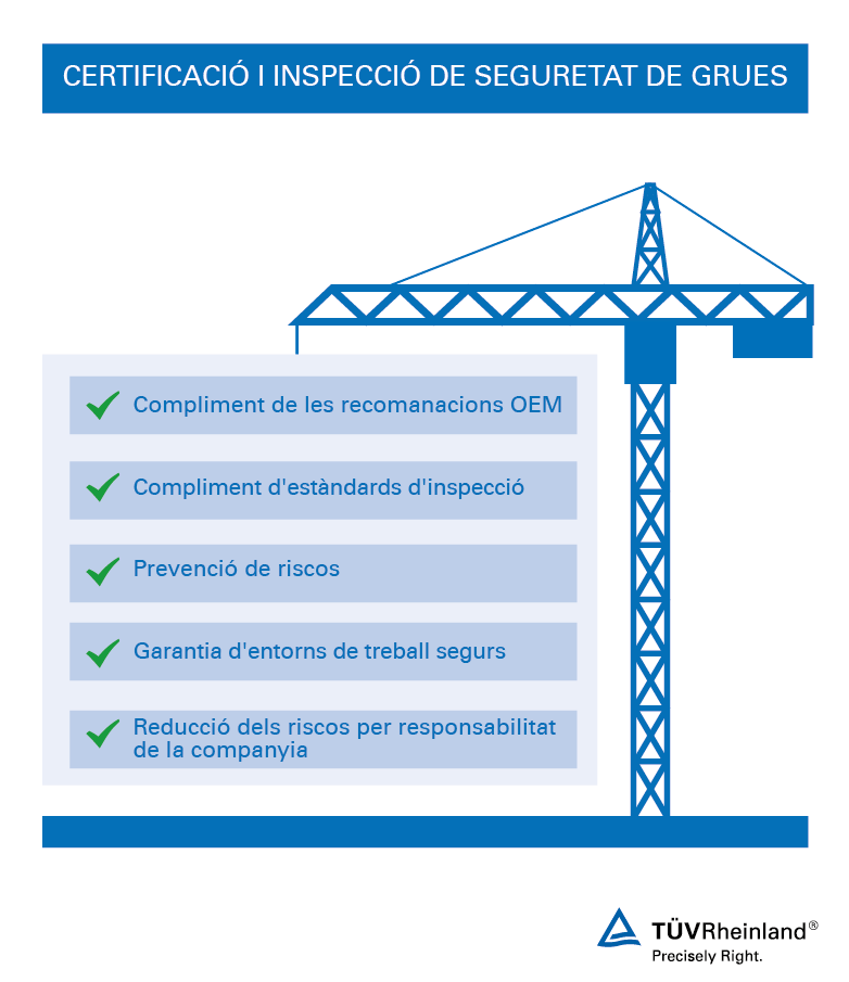 Facilitar un entorn de treball segur redueix el risc d'accidents i demores no desitjades o interrupcions. En accedir a una àmplia gamma de serveis d'inspecció i certificació per a grues i equips d'elevació aèria, els nostres inspectors altament qualificats utilitzen la seva àmplia experiència i la xarxa internacional de TÜV Rheinland per adaptar les solucions a les vostres necessitats específiques.