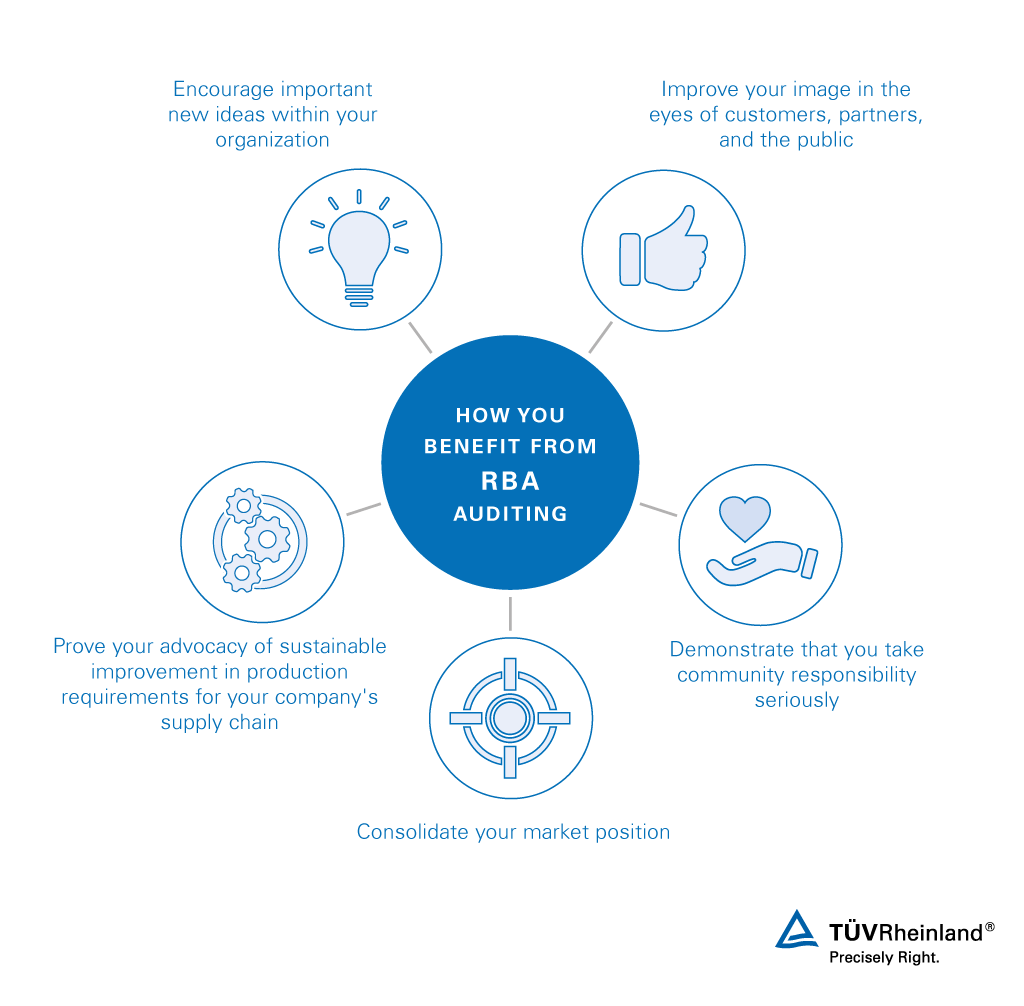 隨著主要製造廠商越來越多地要求其供應廠商自願承諾遵守RBA行為準則,我們依照RBA標準提供稽核服務,以證明符合其準則。RBA稽核使您能證明您的公司遵守企業社會責任(CSR)原則。