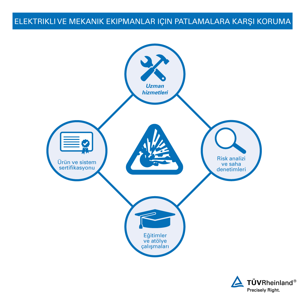 Patlayıcı ortamlarda işletme güvenliği konusunda tanınmış ve deneyimli bir hizmet sağlayıcısı olarak ilgili düzenlemelere uygun şekilde kritik patlamalara karşı koruma testleri yapma ve belgelendirme yetkisine sahibiz. Dünya çapındaki uzmanlarımız ve denetmenlerimiz sizlere ATEX 95 (94/9/EC) Yönetmeliği (Ürün ve Üretim Kalite Güvencesi) ve IECEx 03 Belgeli Hizmet Tesisleri planı gibi Avrupa ve uluslararası düzenlemelere uygun şekilde üretim sistemi belgelendirmesi ve tesis onayı hizmetleri sunuyor. Global uzman ağımız özel gereksinimlerinize göre uyarlanan çözümler hazırlıyor. Personelinizin en yüksek güvenlik standartlarına göre bütünlük arz eden bir yetkinliğe sahip olmasını sağlamak amacıyla personelinizi eğitmek üzere IECEx akreditasyonuna sahibiz. Uygulama kapsamında yetkinlik birimlerine göre IECEx 05 uygunluğu ve teknik yeterliğin yanı sıra Personel Yetkinlik Belgesi (CoPC) düzenleme yetkisine sahibiz. AB Onaylanmış Kuruluş ve Belgelendirme Kurumu olarak referanslarımız kapsamlı uzmanlığımıza, deneyimimize ve dünya pazarlarında çeşitli ürünler için patlamalara karşı dayanıklılık konusunda uygun belgelendirmeyi sağlamada dünya çapındaki varlığımızı ortaya koymaktadır.