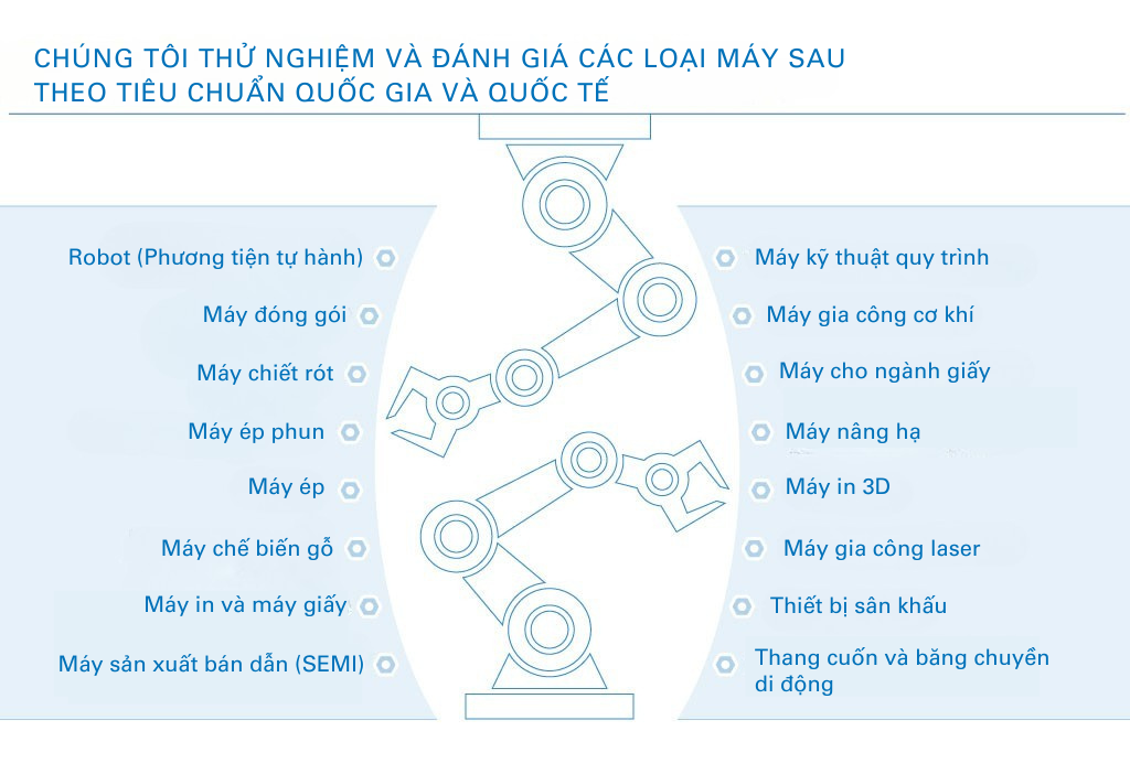 Chuyên gia của chúng tôi thử nghiệm và đánh giá máy móc công nghiệp một cách đáng tin cậy. Do đó, doanh nghiệp có thể yên tâm rằng các máy móc được đáp ứng các tiêu chuẩn chất lượng và an toàn cao nhất. Chúng tôi hỗ trợ doanh nghiệp với các dịch vụ sau: