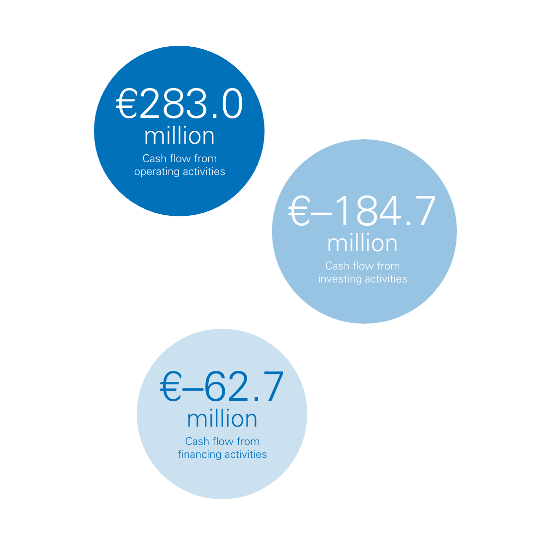 At €283.0 million, the positive cash flow from operating activities in financial year 2024 was 39.2% higher than the previous year’s figure. The change is mainly attributable to the improved consolidated net income. The consolidated net income of €132.6 million was offset by non-cash depreciation and amortization of €143.3 million (previous year: €145.4 million). The negative cash flow from investing activities decreased slightly by €12.8 million compared to the previous year. At €62.7 million, the negative cash flow from operating activities in financial year 2024 was nearly the same as the previous year.