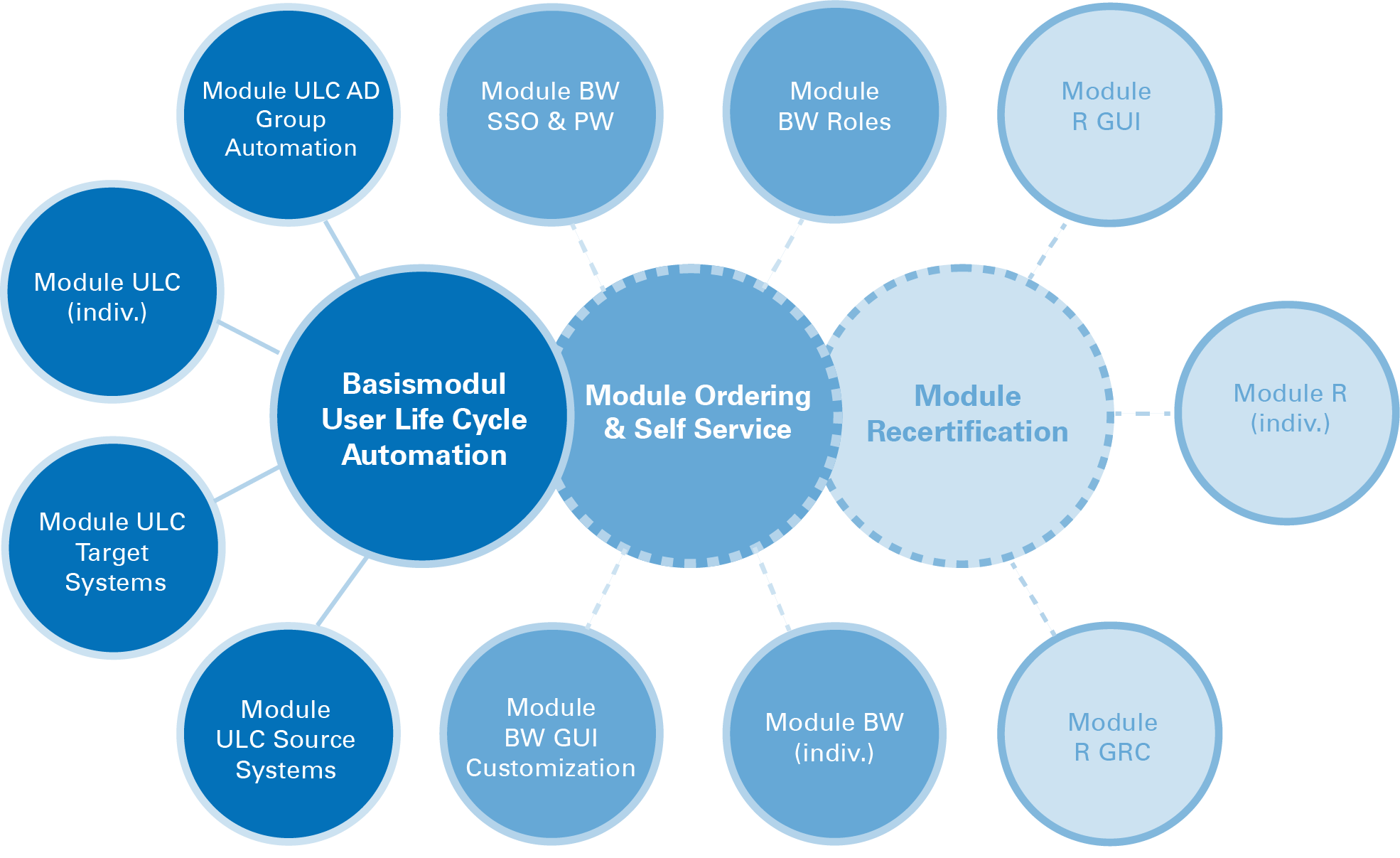 The best practice modules are structured in such a way that a base module (Automation of the User Life Cycle) is required as a foundation. Based on this base module, our customers can acquire additional modules as needed (e.g., Ordering / Self Service, Recertification or Web Access Management). The modular approach gives our customers the opportunity to upgrade the established solution in economical smaller steps, phase by phase and module by module.