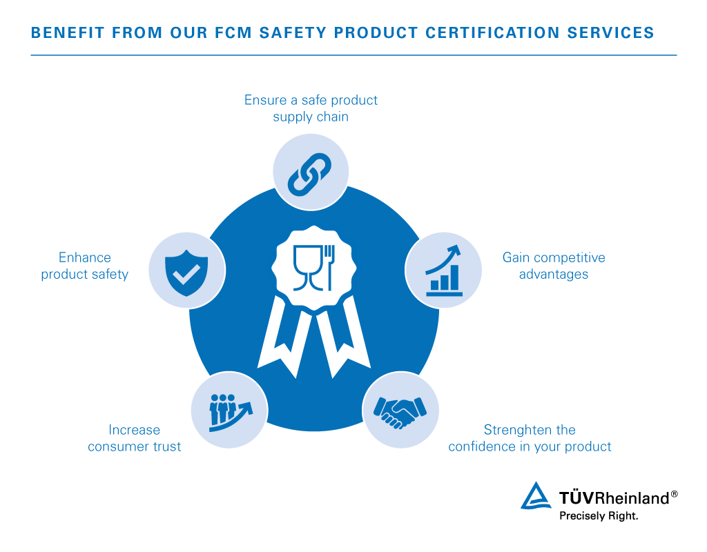 TÜV Rheinland’s product certification and testing marks are globally recognized by the market as evidence of product safety and compliance. Our global network of Food Contact Material laboratories and experts employ stringent certification processes that provide traceability and conformity – for authorities, business partners and consumers. Make use of our independent testing services to reduce liability risks, speed product launch times, enhance your brand image and rest assured that your FCM products and processes are safe.