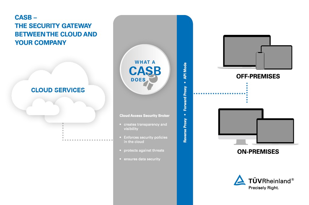 - Compliance: The CASB ensures that companies can implement their security policies not only within their own infrastructure, but also in the cloud. By enforcing security policies for access, authentication and encryption, the CASB increases the level of security.